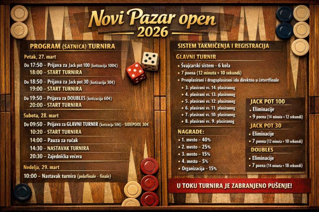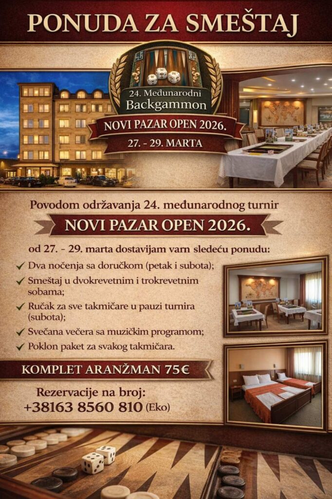 veliko nam je zadovoljstvo i čast da najavimo da će i ove godine Novi Pazar biti domaćin međunarodnog backgammon (tavla) turnira – 24. po redu.